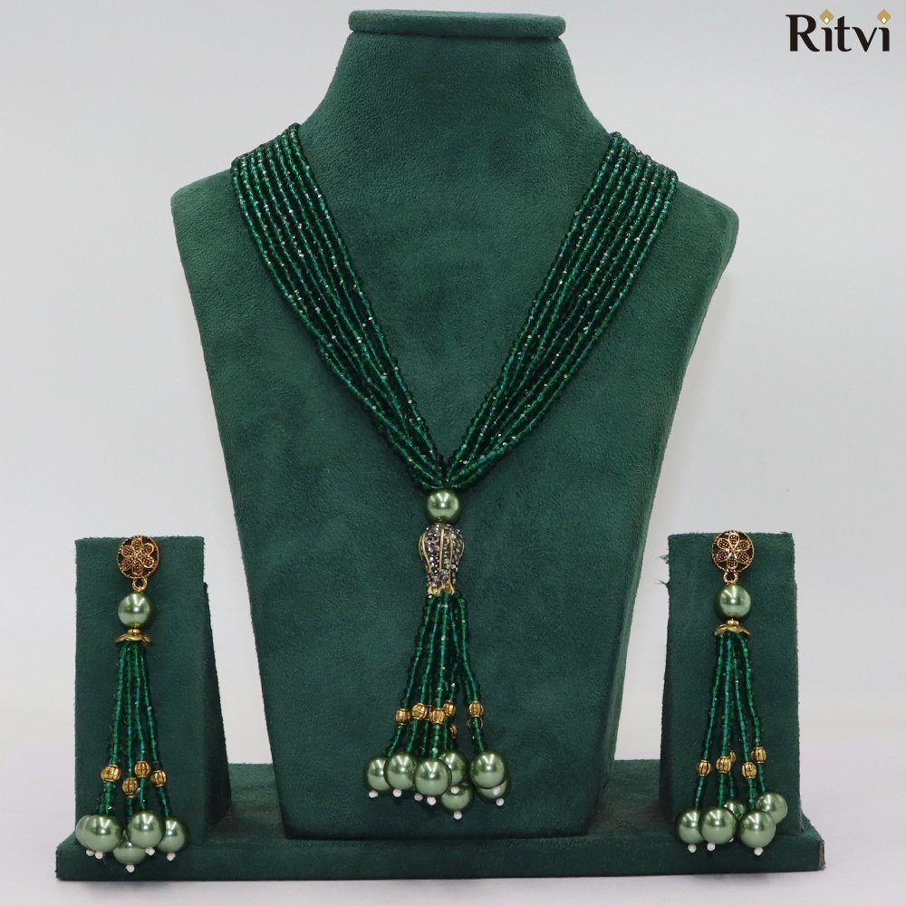 This elegant necklace set features layered strands of rich green crystals, ending in delicate pearl tassels. A perfect blend of shimmer and grace, ideal for festive or traditional occasions.