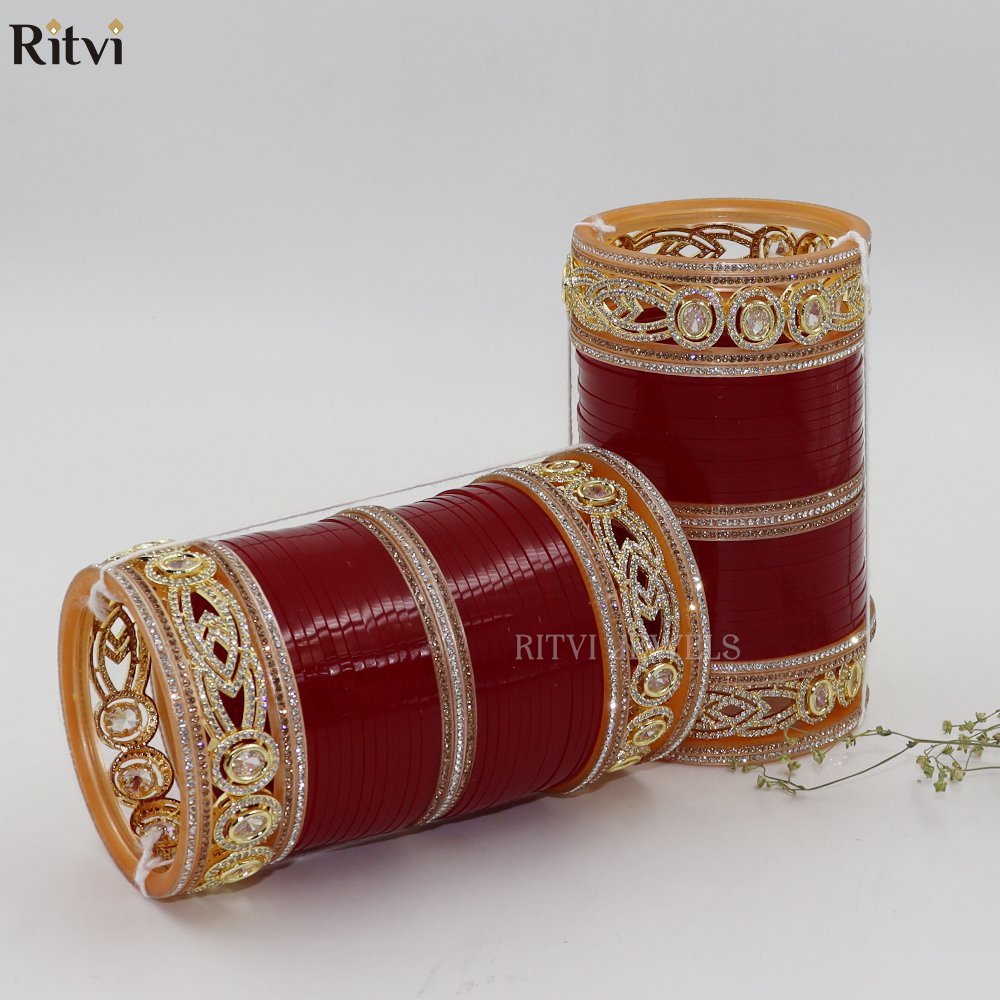 Beautify your hands with our Bridal Chura, designed with the most care and perfection to radiate royalty, elegance and tradition altogether. Each of our bangle is manually rounded and shaped from inside to provide utmost comfort to give you a rich velvety feel. Ritvi Jewels serves to always provide quality products.