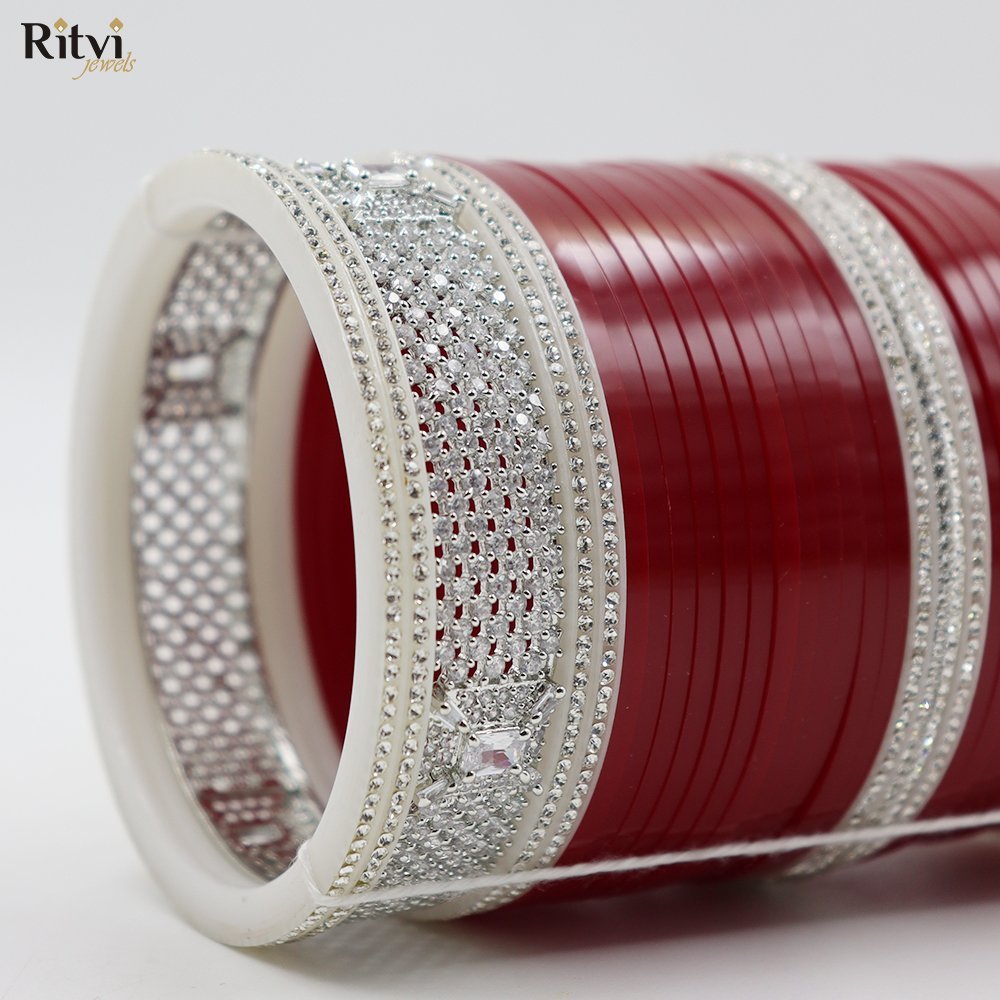Adorned with intricate silver, zircon and stone detailing. The chura symbolizes good fortune, happiness, and a prosperous married life. The design reflects simple and elegant to highly ornate, reflecting cultural richness and personal style.