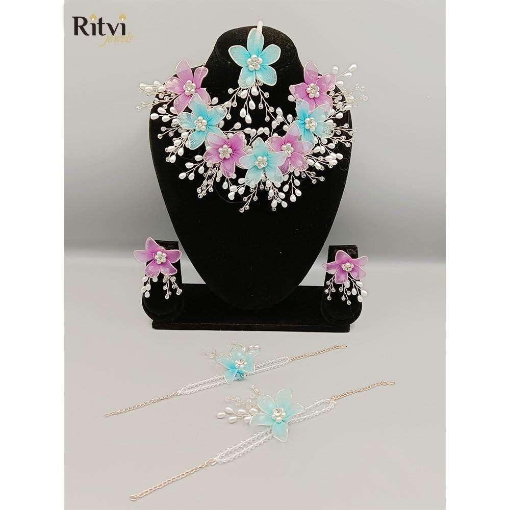 Celebrate your Haldi ceremony in style with this stunning handcrafted artificial flower jewellery set, designed to add a vibrant and elegant touch to your bridal look. Adorned with a mix of delicate fabric flowers in multiple hues, shimmering crystals, and lustrous pearls, this jewellery set is a perfect blend of tradition and modern charm. Lightweight and comfortable to wear, this jewellery is ideal for a bride who wants to embrace floral elegance while standing out with a unique, handcrafted touch.