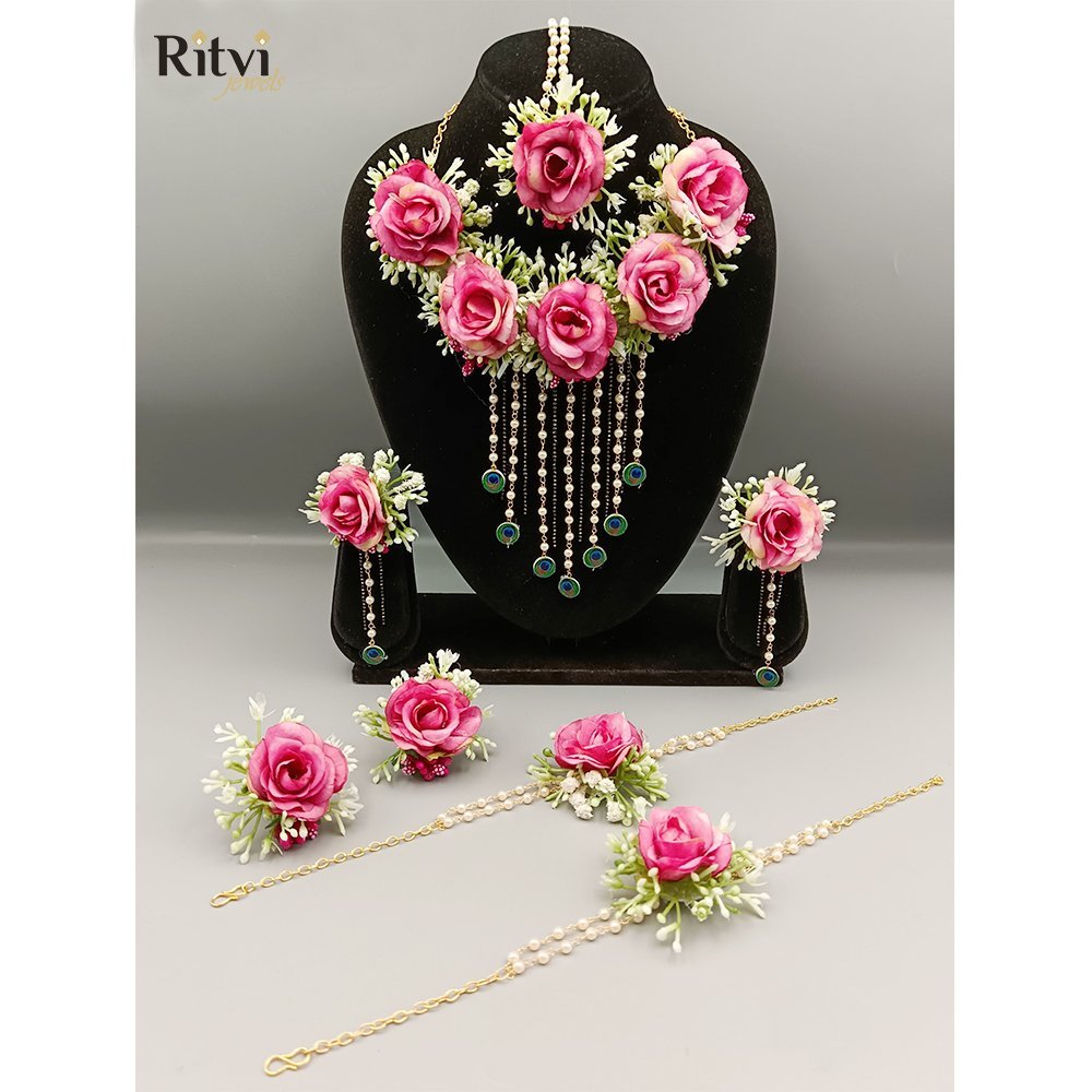 Embrace elegance with this breathtaking pink artificial flower jewellery set, intricately handcrafted with pearls, beads, and gypsy flowers, designed to make the bride shine during her Haldi ceremony. The delicate peacock detailing adds a regal touch, symbolizing beauty and grace, making this set a unique and meaningful choice for the bride-to-be.