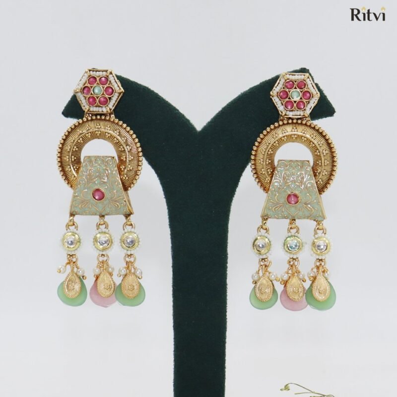 This exquisite set includes a floral maang tikka, statement earrings, a necklace, bracelet, and two rings, ensuring a complete and well-coordinated look. Lightweight, comfortable, and effortlessly stylish, this jewellery set is perfect for a bride who loves a blend of tradition, artistry, and contemporary aesthetics.