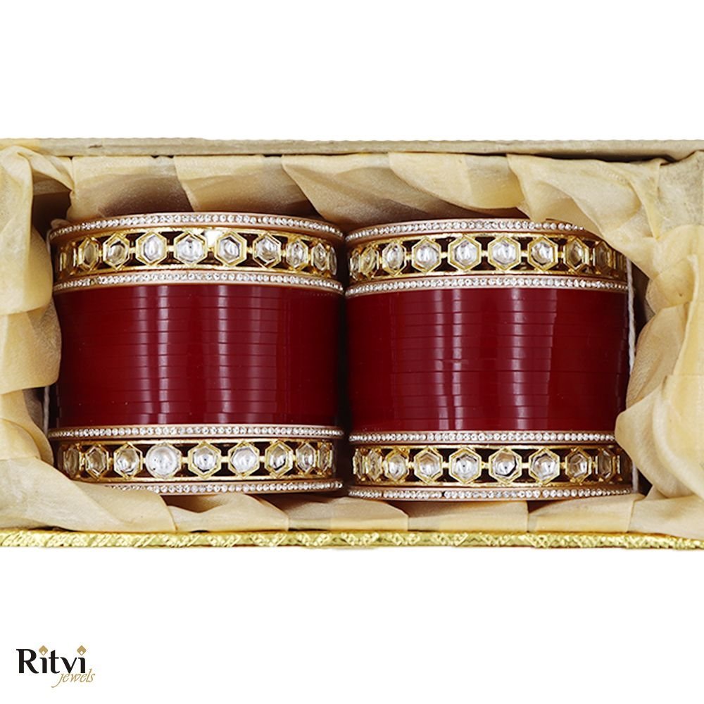 Beautify your hands with our Kavya Mini Bridal Gold Chura , designed with the most care and perfection to radiate royalty, elegance and tradition altogether. Each of our bangle is manually rounded and shaped from inside to provide utmost comfort to give you a rich velvety feel. Ritvi Jewels serves to always provide quality products.