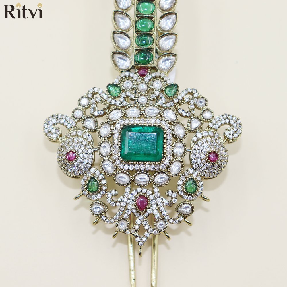 This majestic emerald peacock Kundan kalgi features intricate craftsmanship with a blend of white stones, vivid emeralds, and subtle ruby highlights. Designed for weddings and grand occasions, it adds a luxurious and traditional touch to a groom’s ceremonial ensemble.