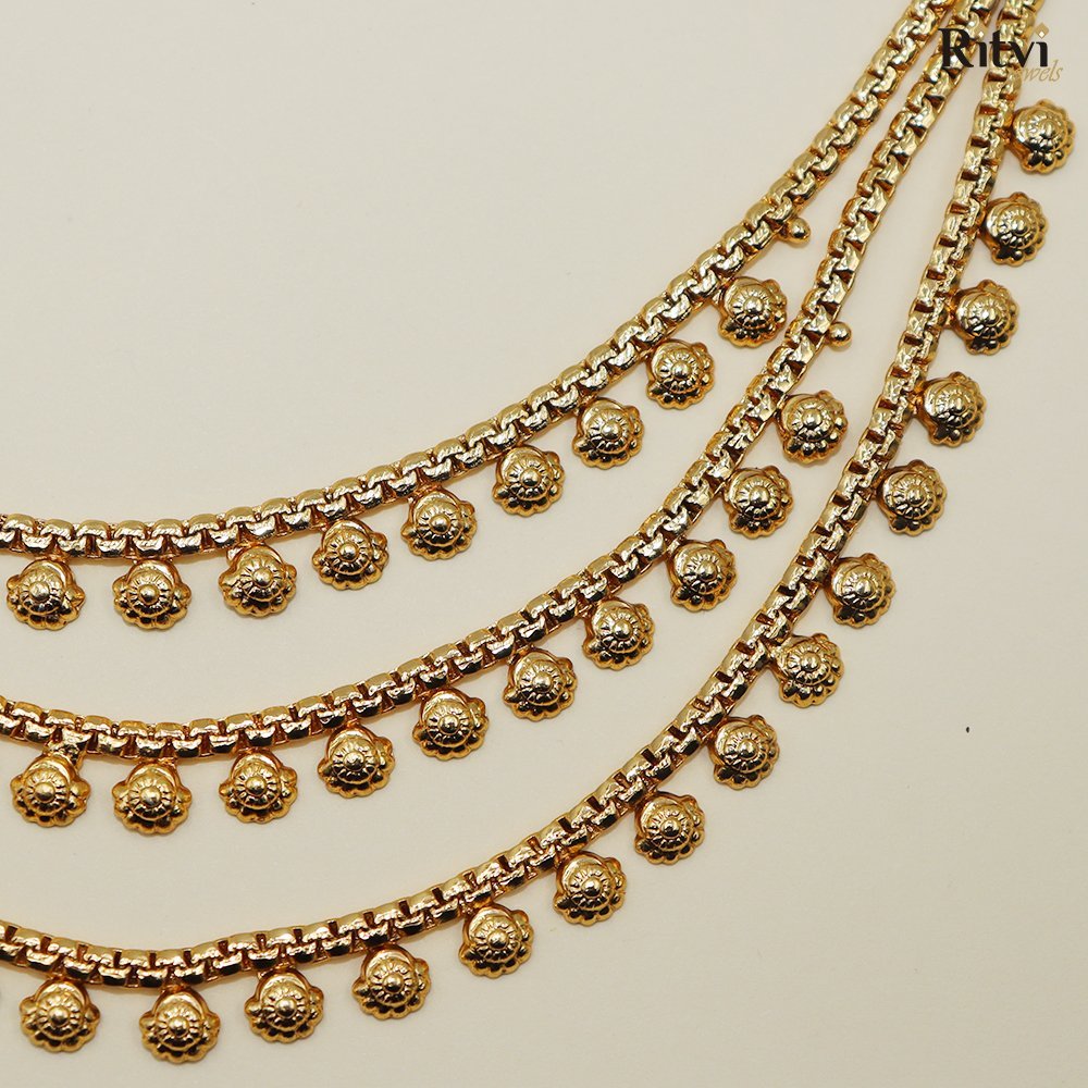 Made from high-quality gold-plated metal, the chain is often embellished with detailed motifs such as paisleys, floral patterns, or temple-inspired designs. Some variations feature sparkling kundan, pearls, or colored gemstones to match the bridal or festive attire. The design can range from a single thin chain to multiple layered strands, each adding its own charm and regality.