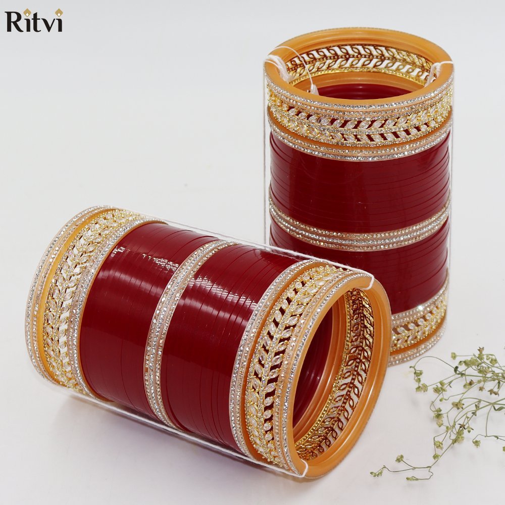 Beautify your hands with our Bridal Chura, designed with the most care and perfection to radiate royalty, elegance and tradition altogether. Each of our bangle is manually rounded and shaped from inside to provide utmost comfort to give you a rich velvety feel. Ritvi Jewels serves to always provide quality products.