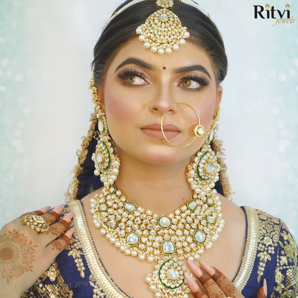 A resplendent Kundan bridal jewellery set that embodies timeless elegance. Designed with layers of uncut stones, pearls, and green accents, it features a majestic choker with matching earrings, sheeshpatti and maang tikka. A perfect blend of grace and grandeur for the modern bride.
