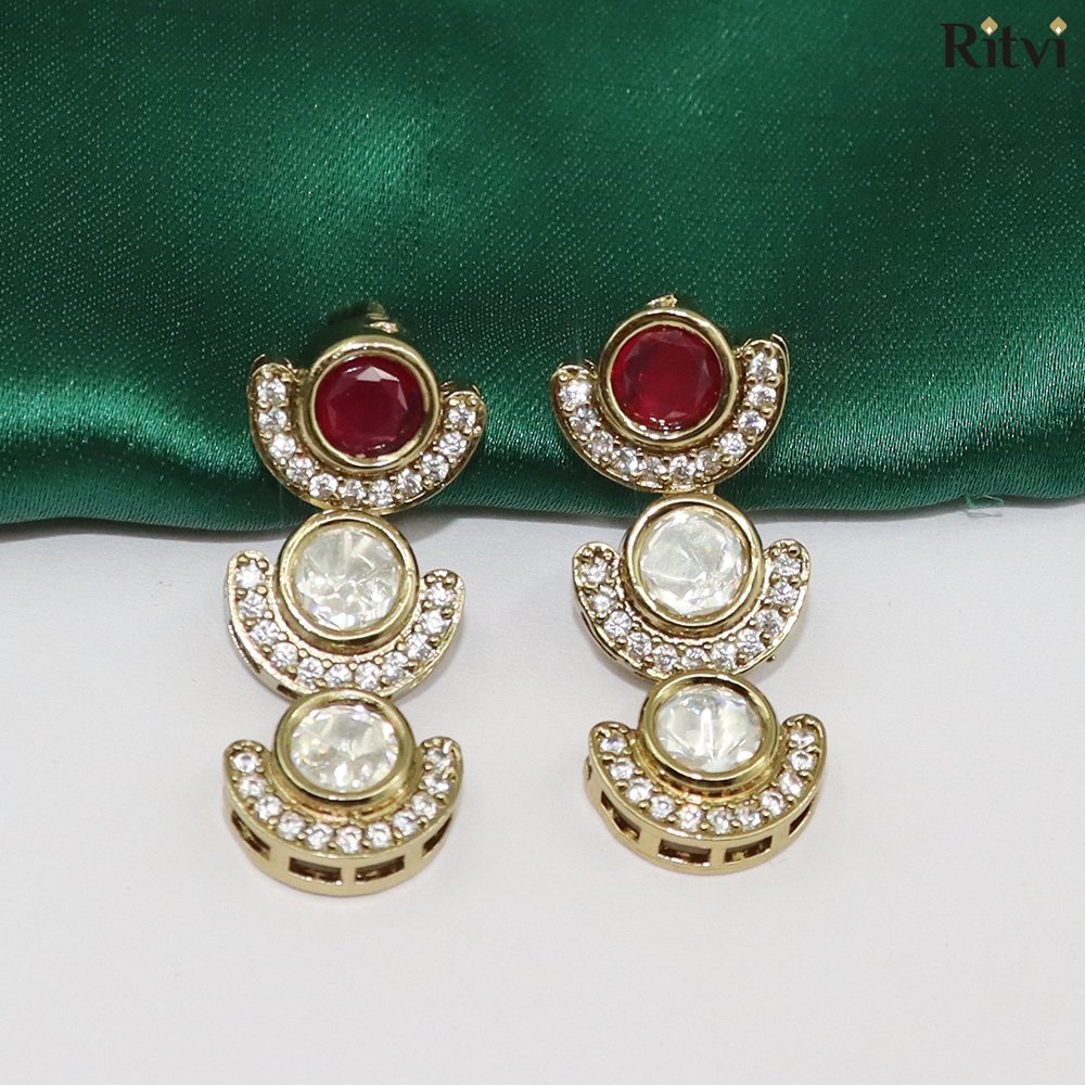 Introducing Celestial Crescent Drops by Ritvi Jewels—graceful earrings adorned with three dazzling stones, each embraced by sparkling crescent motifs. The bold red top stone adds a pop of color, making them perfect for weddings, celebrations, or statement ethnic wear.
