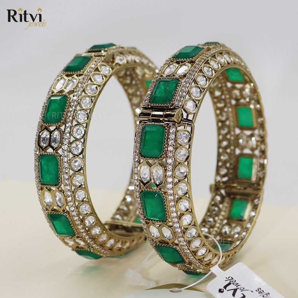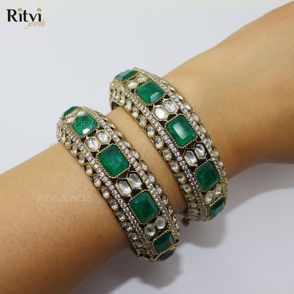 Ritvi Jewels presents a pair of intricately crafted bangles showcasing vivid green gemstones embedded in a gold-toned framework.