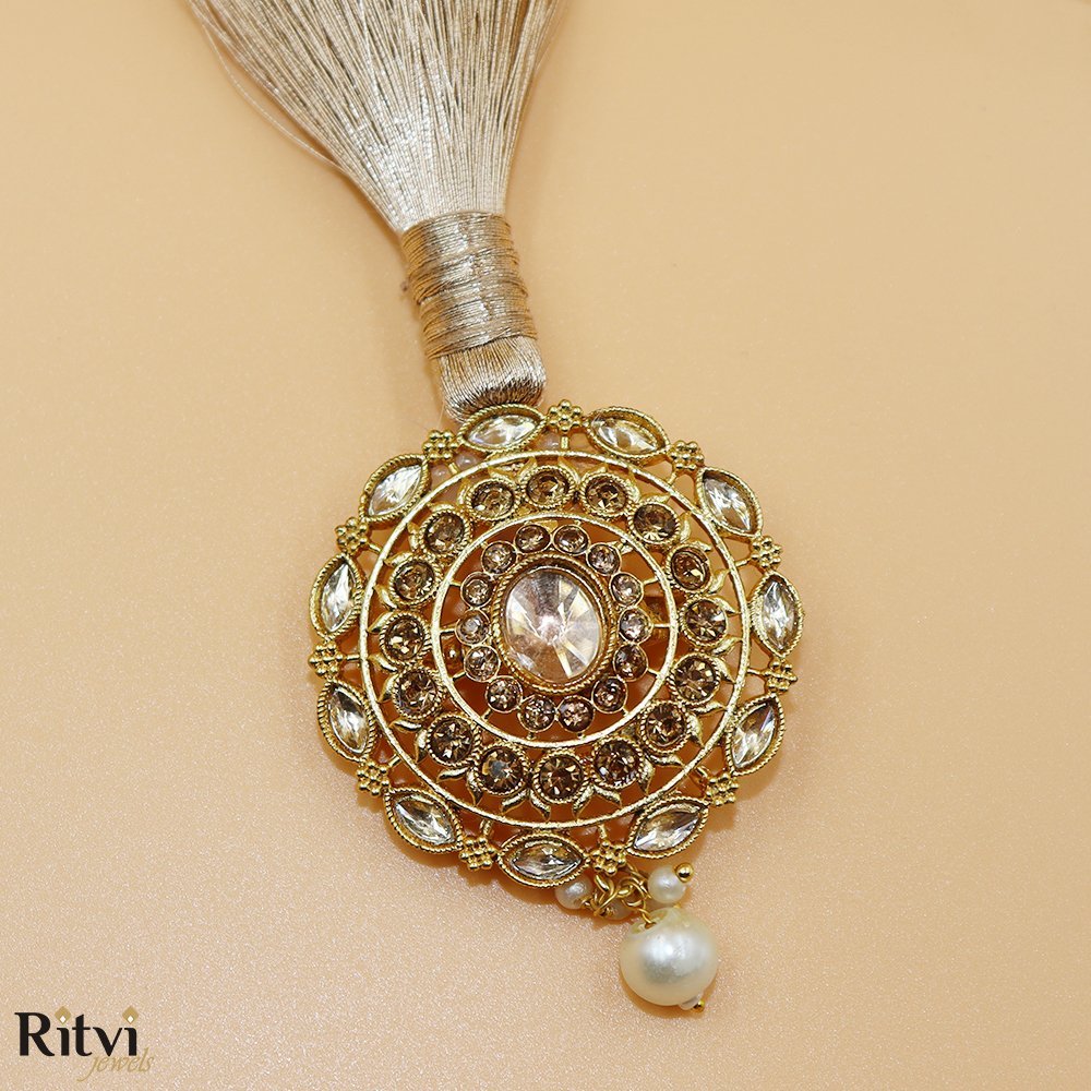 The Guneet Regal Round Kalgi features a striking circular design adorned with dazzling polki stones, a central gem, and rich red feathers. This statement accessory brings traditional elegance and a majestic touch to the groom’s wedding look, ensuring timeless grandeur.