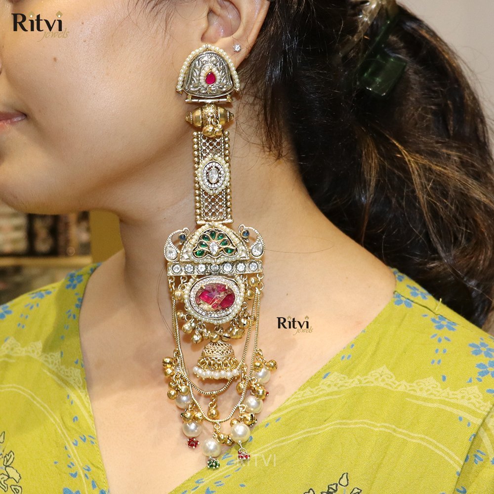 Elevate your style with our oversized handcrafted long earrings, designed to make a bold statement. Made from high-quality brass with an anti-tarnish finish, these earrings ensure durability while maintaining their radiant charm. Inspired by Jaipur’s rich heritage and boho-tribal aesthetics, they feature intricate detailing, exuding a free-spirited yet regal vibe. Perfect for those who love distinctive, artisanal jewelry, these earrings add a touch of ethnic elegance to any outfit—whether it’s a casual day out or a festive occasion.