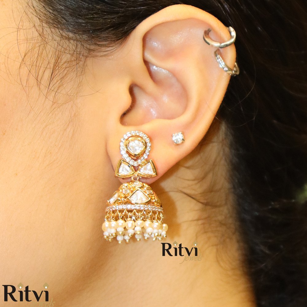 Kohinoor Jhumkis feature sparkling kundan and AD stones with pearl hangings and a golden dome. A stunning blend of elegance and tradition, perfect for festive events and special celebrations.