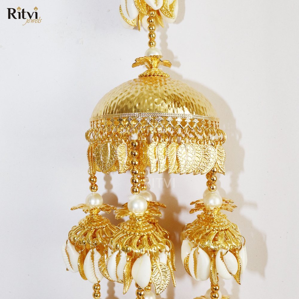 These traditional hanging ornaments also called Kaleera are worn by brides in India and are usually crafted as umbrella-shaped structures with intricate details, including beads, tassels, pearls, shells, butterflies, hearts and sometimes even ghungroos (small bells). The intricate designs, materials, and rituals of Kalira reflect the region’s cultural heritage. It’s believed that if a piece of the Kalira falls on someone, they’ll be the next to get married. This tradition adds an element of excitement and anticipation to the wedding celebrations. Bridal Kaleera are not just accessories but are deeply rooted in tradition and cultural symbolism, representing prosperity, happiness, and the bond of marriage. They encapsulate the blessings, hopes, and well-wishes for the bride’s journey into married life.