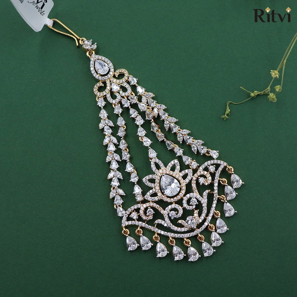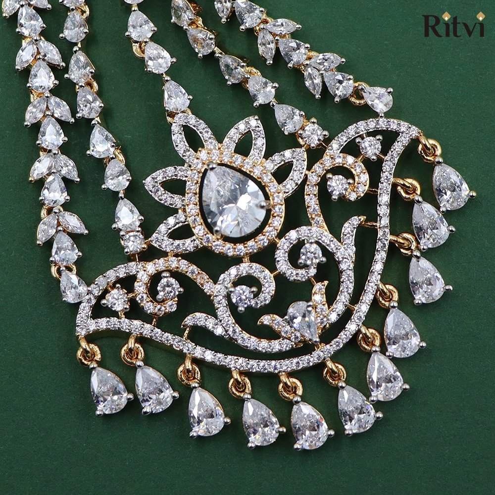 The intricate framework is adorned with shimmering American diamonds (zircons), creating a dazzling play of light with every movement. Delicate drop hangings gracefully cascade from the design, adding a sense of fluidity and grandeur.