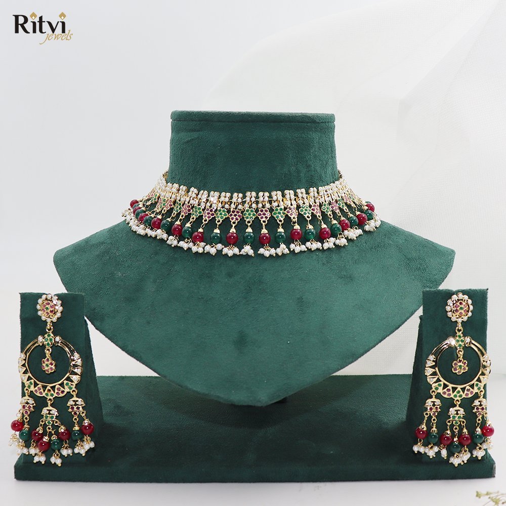 This vibrant and traditional necklace set from Ritvi Jewels radiates festive charm and ethnic elegance. The necklace features a richly detailed design with clusters of red, green, and pink enamel floral motifs, accentuated by sparkling white stones. Dangling ruby-red and emerald-green beads enhance the colorful aesthetic, while delicate pearl drops add a touch of grace and movement. The set is paired with matching circular earrings, intricately crafted with floral accents and bead hangings, completing the regal look. Perfect for weddings, cultural celebrations, or traditional attire, this set adds a joyful splash of color and sophistication to any ensemble.