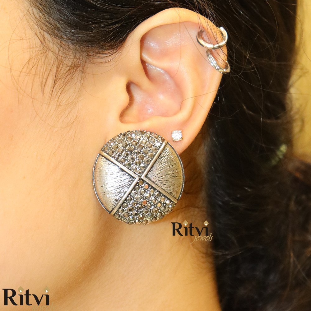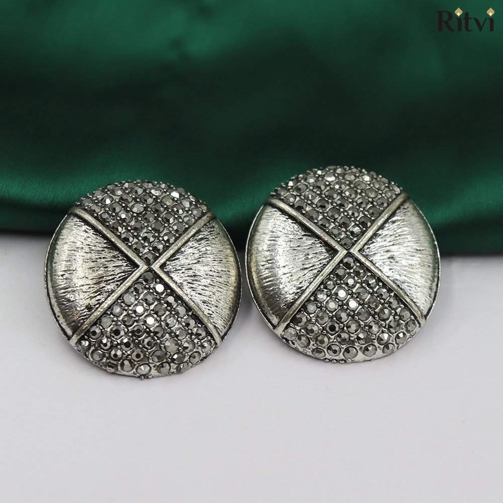 These antique silver-toned round studs from Ritvi Jewels feature a textured quadrant design with intricate detailing and sparkling accents, offering a bold, vintage-inspired look perfect for ethnic or contemporary outfits.