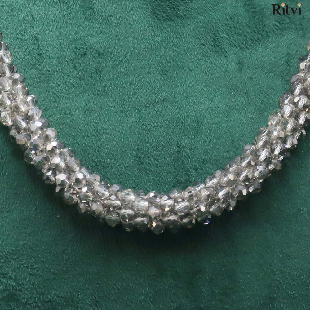 The Zaria Silver Crystal Necklace exudes glamour with its meticulously handwoven crystal beads that reflect light beautifully. Ideal for parties, weddings, or evening events, this versatile piece enhances your neckline with radiant sparkle and a luxurious, refined appeal.