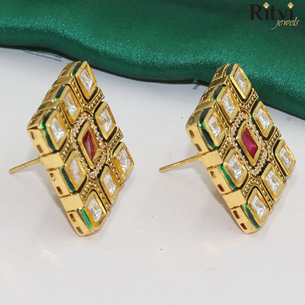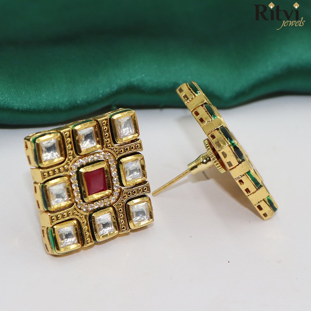 These ornate square studs feature a central ruby-like stone surrounded by dazzling white stones. The intricate gold detailing and symmetrical design make them a timeless choice for festive and traditional occasions.