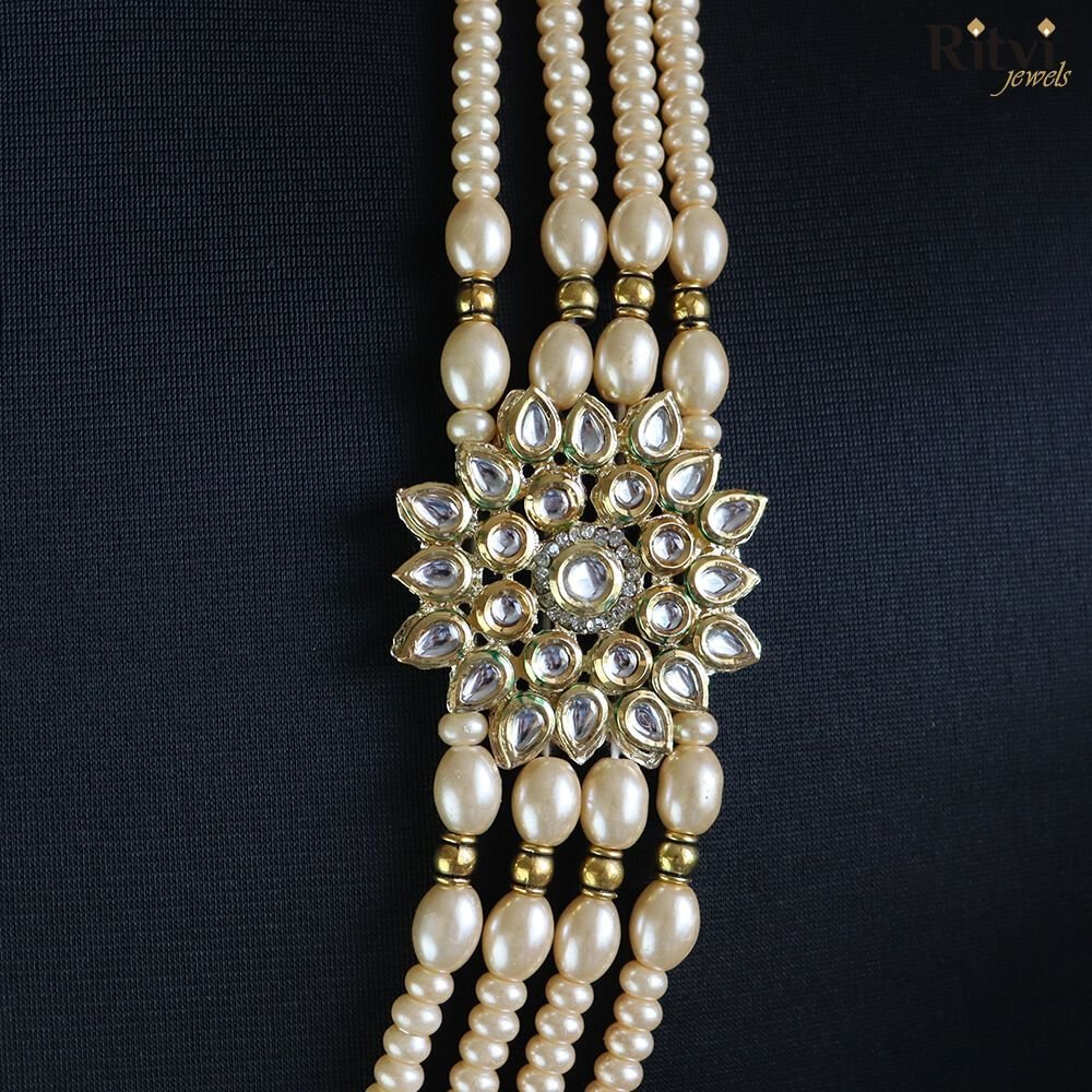 The choice of wedding jewellery should reflect the groom’s personal style, cultural traditions, and the overall theme of the wedding. It’s essential to choose pieces that make the groom feel comfortable and confident on his special day. Sherwani “Mala” or “Haar” comes in various lengths and designs, ranging from delicate and intricate to bold and opulent. Our Ritvi Groom pearl Mala adds a royal and regal touch to the groom’s appearance. Pair this gorgeous pearl mala with any of your traditional attire for a complete look. The Mala will surely take your wedding or festive look a notch higher when paired with any kurta, sherwani or indo-western.