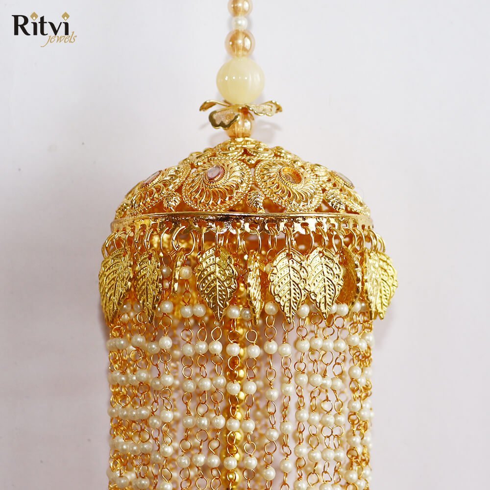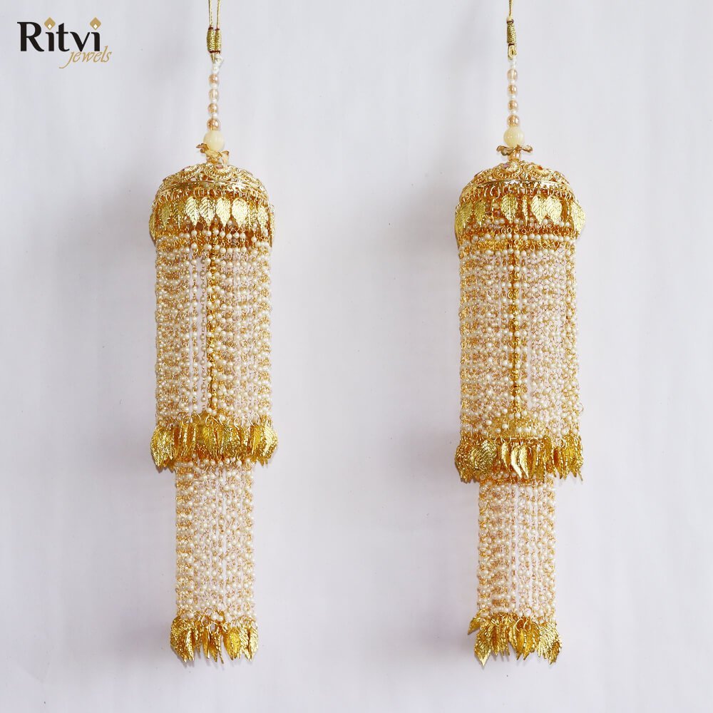 These traditional hanging ornaments also called Kaleera are worn by brides in India and are usually crafted as umbrella-shaped structures with intricate details, including beads, tassels, pearls, shells, butterflies, hearts and sometimes even ghungroos (small bells). The intricate designs, materials, and rituals associated with Kalira reflect the cultural heritage of the region. It’s believed that if a piece of the Kalira falls on someone, they’ll be the next to get married. This tradition adds an element of excitement and anticipation to the wedding celebrations. Bridal Kaleera are not just accessories but are deeply rooted in tradition and cultural symbolism, representing prosperity, happiness, and the bond of marriage. They encapsulate the blessings, hopes, and well-wishes for the bride’s journey into married life.