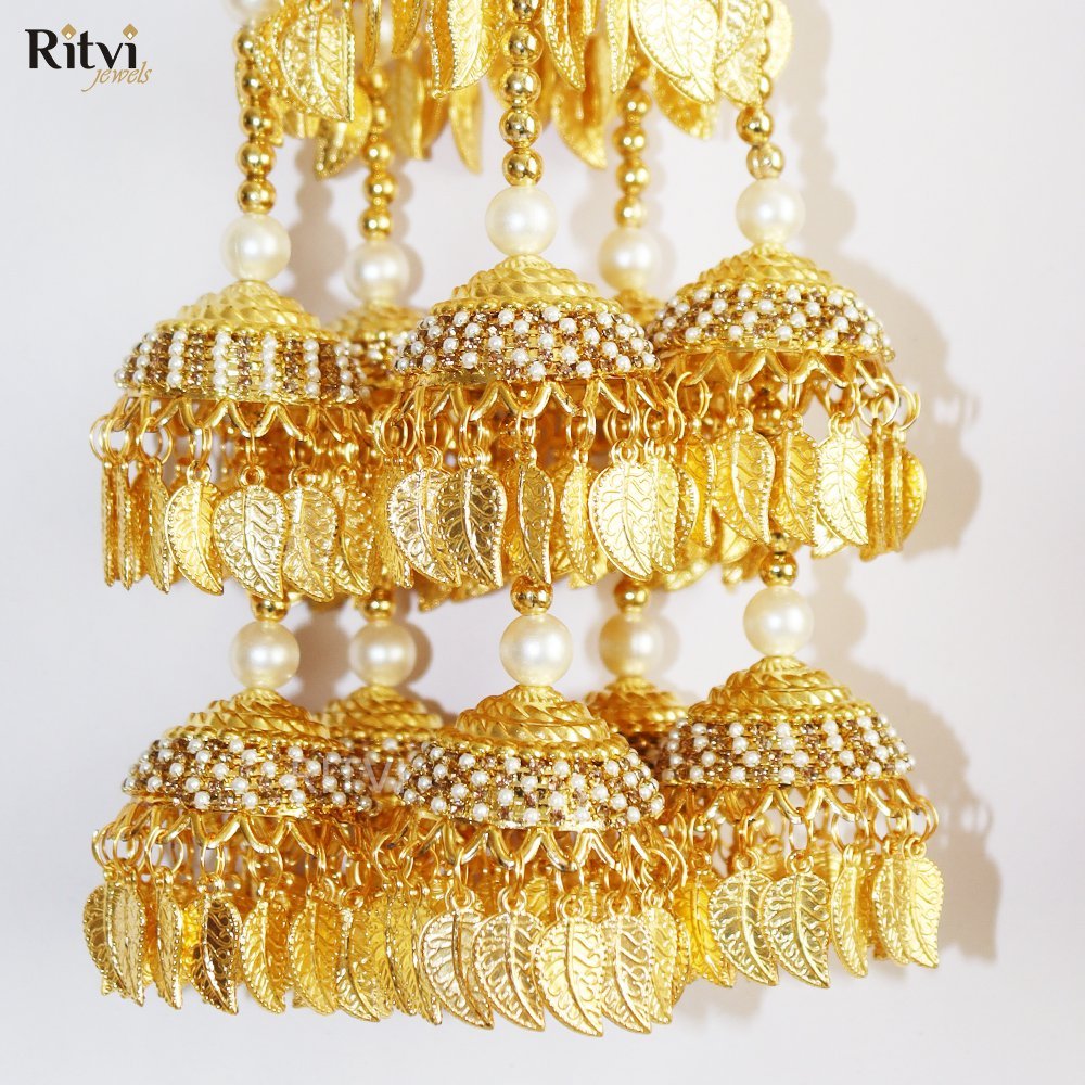 These traditional hanging ornaments also called Kaleera are worn by brides in India and are usually crafted as umbrella-shaped structures with intricate details, including beads, tassels, pearls, shells, butterflies, hearts and sometimes even ghungroos (small bells). The intricate designs, materials, and rituals associated with Kalira reflect the cultural heritage of the region. It’s believed that if a piece of the Kalira falls on someone, they’ll be the next to get married. This tradition adds an element of excitement and anticipation to the wedding celebrations. Bridal Kaleera are not just accessories but are deeply rooted in tradition and cultural symbolism, representing prosperity, happiness, and the bond of marriage. They encapsulate the blessings, hopes, and well-wishes for the bride’s journey into married life.