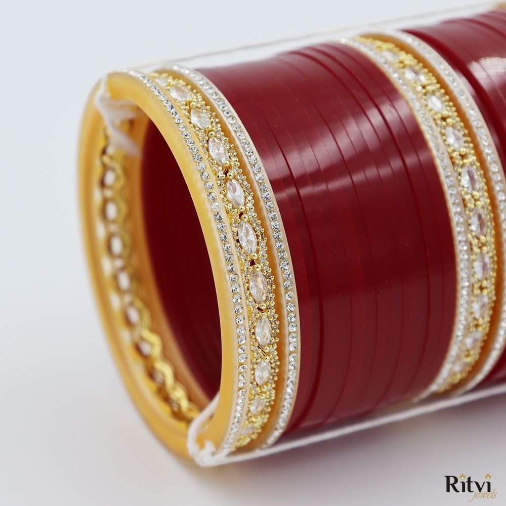 Beautify your hands with our Bridal Chura, designed with the most care and perfection to radiate royalty, elegance and tradition altogether. Each of our bangle is manually rounded and shaped from inside to provide utmost comfort to give you a rich velvety feel. Ritvi Jewels serves to always provide quality products.
