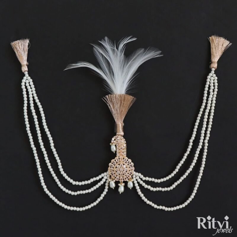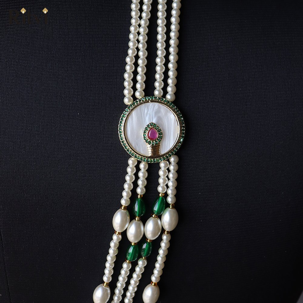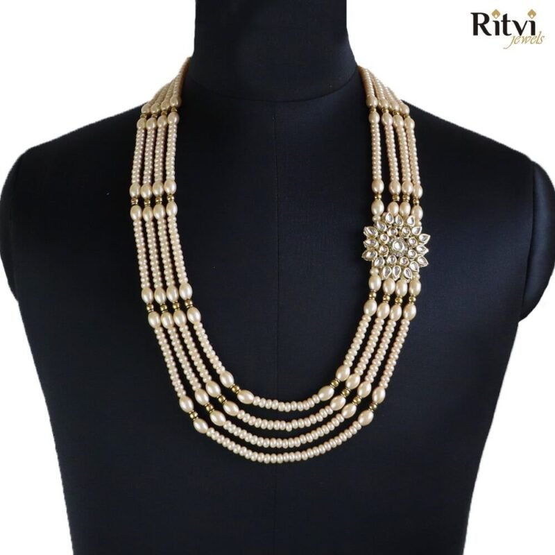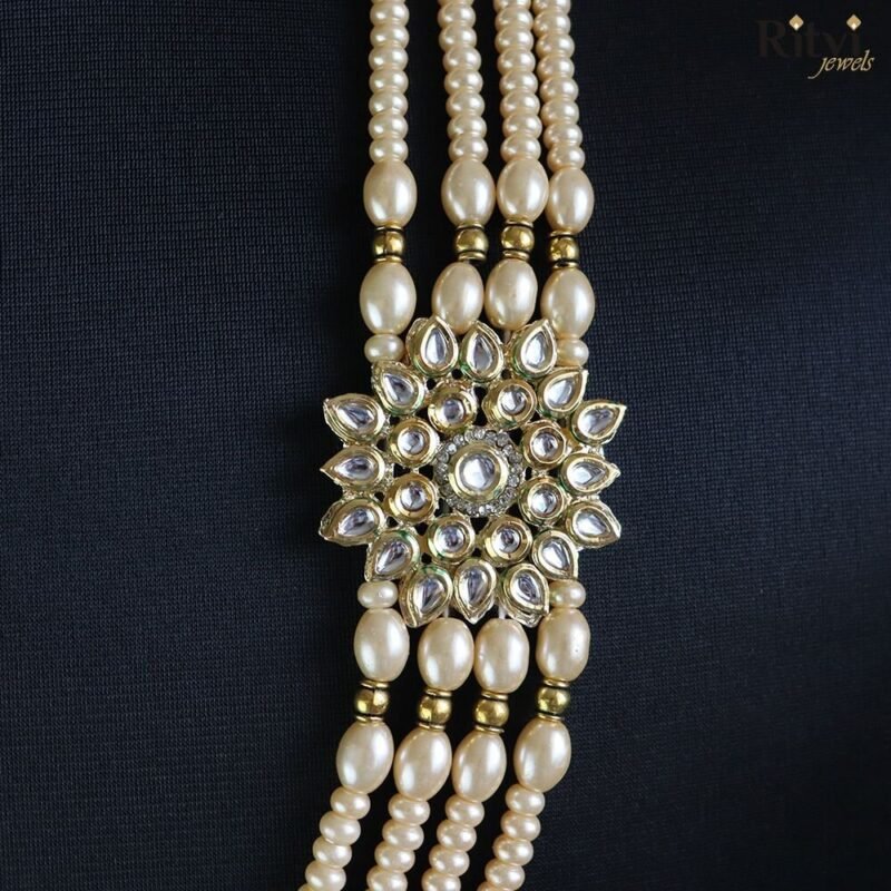 The choice of wedding jewellery should reflect the groom’s personal style, cultural traditions, and the overall theme of the wedding. Choosing pieces that make the groom feel comfortable and confident on his special day is essential. Sherwani “Mala” or “Haar” comes in various lengths and designs, ranging from delicate and intricate to bold and opulent. Our Ritvi Groom pearl Mala adds a royal and regal touch to the groom’s appearance. Pair this gorgeous pearl mala with any of your traditional attire for a complete look. The Mala will surely take your wedding or festive look a notch higher when paired with any kurta, sherwani or indo-western.