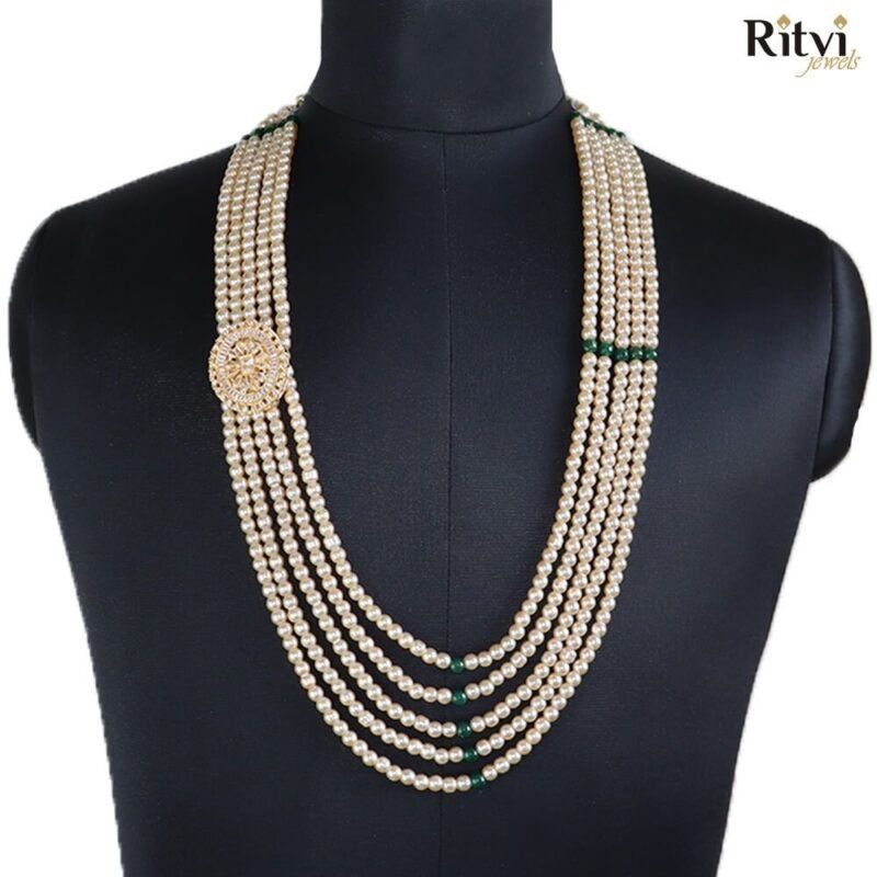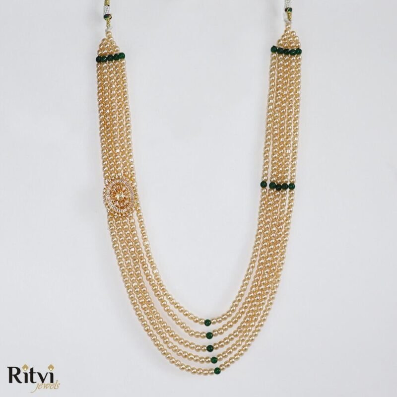 Ritvi Sea Green & White Pearl 4 Line Sherwani Mala