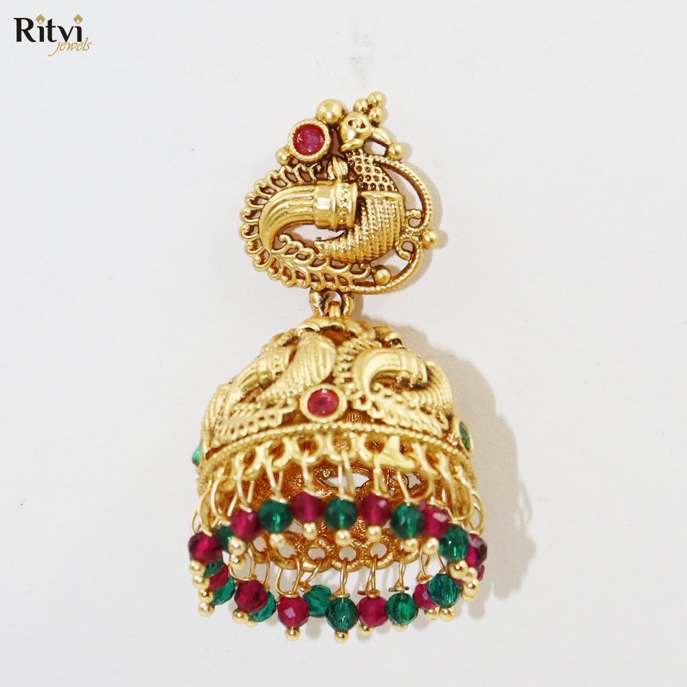These ornate gold jhumka earrings from Ritvi Jewels showcase elegant peacock motifs, accented with red and green gemstone embellishments. The domes are adorned with colorful bead tassels, adding a touch of vibrance—ideal for festive occasions and traditional attire.