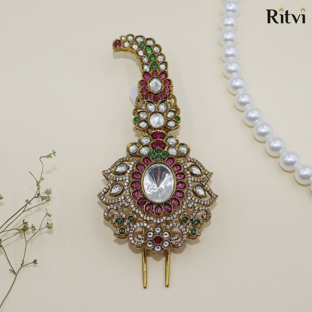 Kalgi is a traditional Indian ornament worn by grooms, as part of their wedding attire. It’s one of the many elements that contribute to the rich and diverse cultural tapestry of Indian weddings. The Kalgi holds cultural and traditional significance, symbolizing the groom’s special and important role during the wedding ceremony. Our Avian Gold Finished Pearl Kundan Kalgi is studded with precious stones and pearls making it an eye-catching accessory.