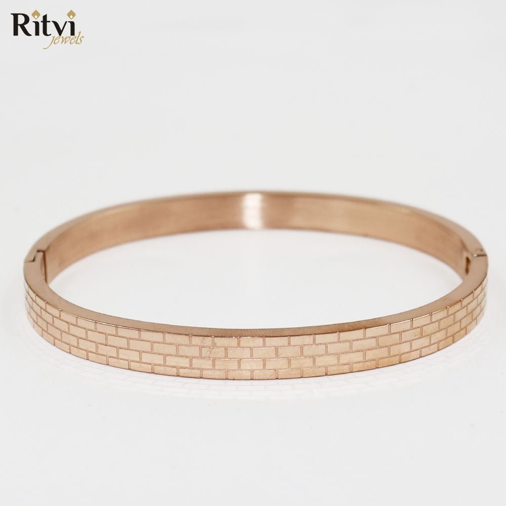 Our Wall Band Bracelet For Women with variation check engravings is a popular accessory for special occasions and cultural events among women. It is typically a solid, circular band with intricate designs or engravings plated in Gold for the rich royal feeling. The bracelet has a comfortable fit and is easy to wear, with a sturdy clasp to keep it secure on the wrist, with an openable lock.