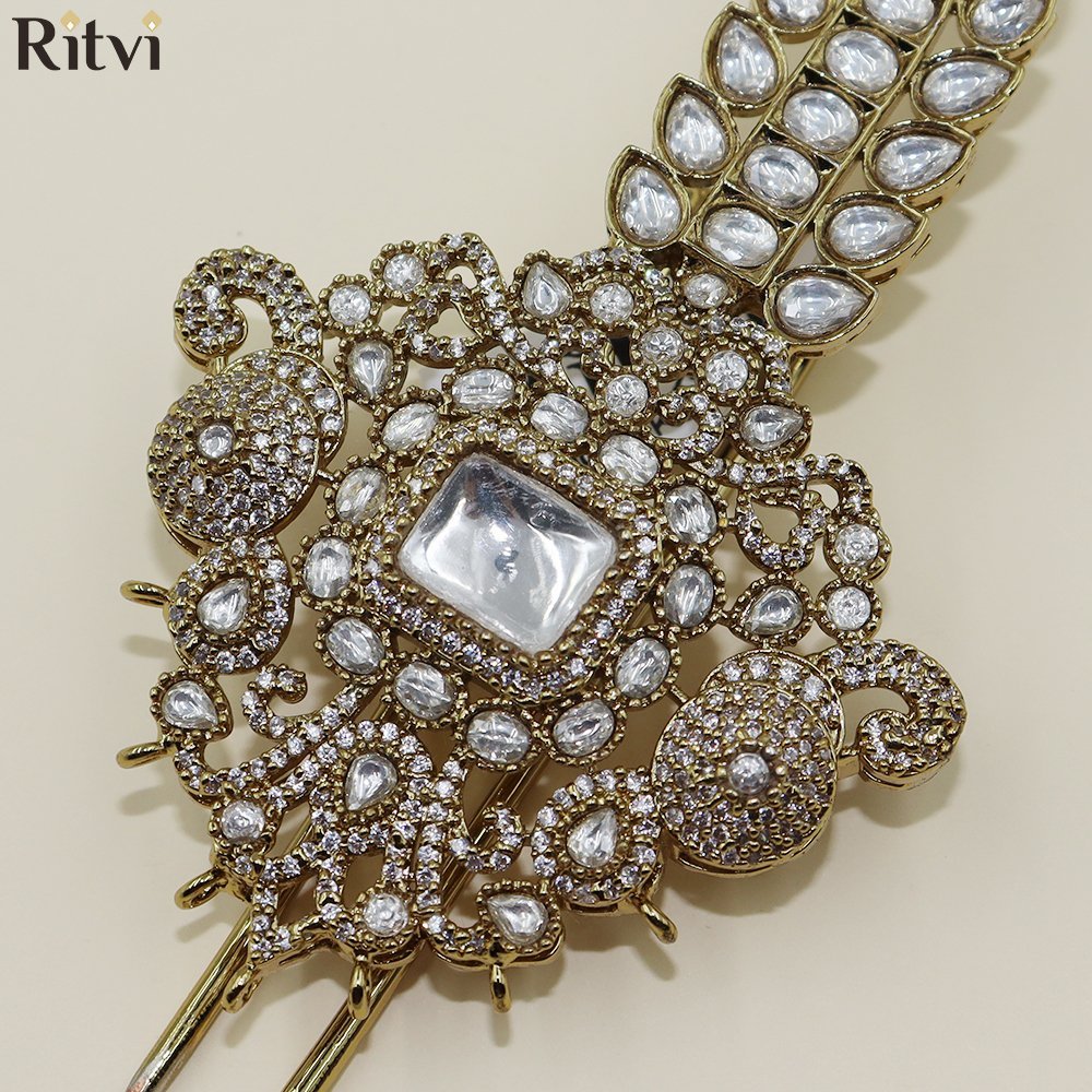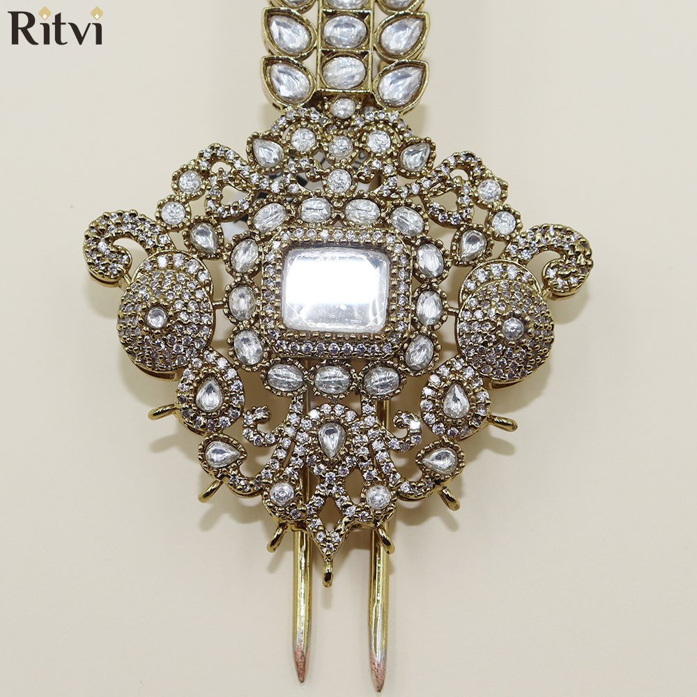 The Royal Kundan Pearl Kalgi features intricate craftsmanship with dazzling polki stones set in a gold-tone base, enhanced by a graceful pearl drop. Perfect for grooms, it exudes royal charm and timeless elegance, elevating any wedding turban to majestic perfection.