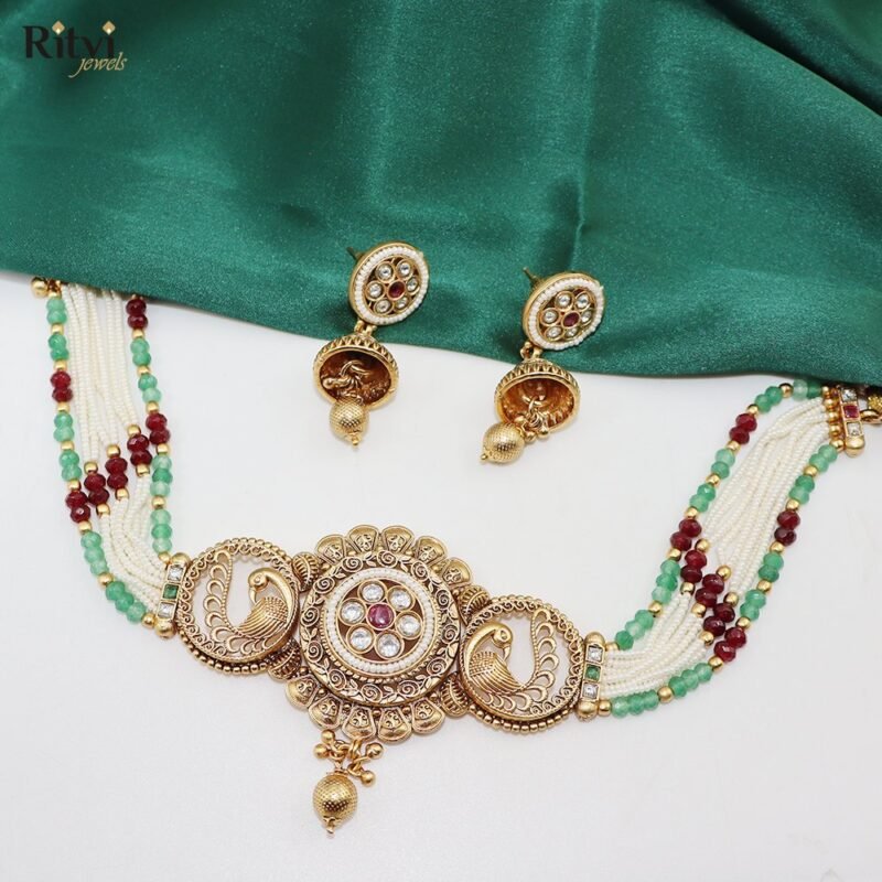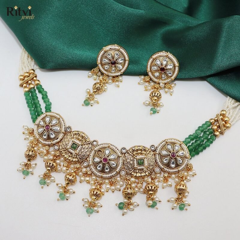 Our Sakshika Kundan Pearl Choker Set is called out for it’s intricate design, rich embellishments, and regal appearance. The Multicolor bead detailing suits every Indian outfit. It is crafted in the finest quality material. A Kundan necklace is a masterpiece of craftsmanship and artistry, embodying the essence of Indian culture and heritage. Whether worn on special occasions like weddings, festivals, or celebrations, or showcased as a part of one’s jewelry collection, this necklace is a timeless treasure that exudes elegance and grandeur.