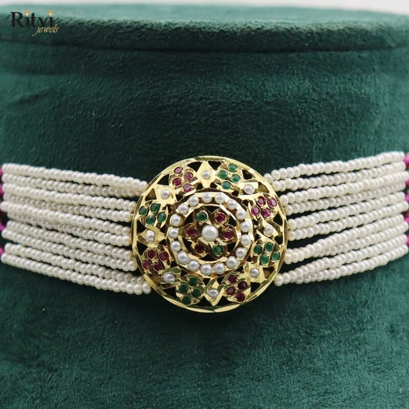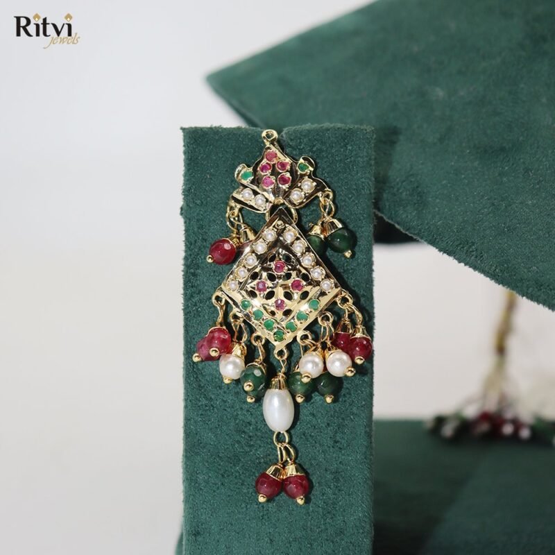 Antique necklaces are becoming highly wanted in the modern world because of the look they carry, the craftsmanship and the color stones they use to embellish. And what better way than to have your favourite vintage necklaces at your doorstep by just one click away. Shop our Shriya antique gold necklace set with white cage and imitation stone detailing.