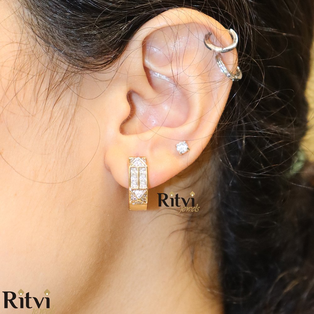 Ritvi Jewels presents sophisticated gold-toned earrings with a striking geometric structure, adorned with brilliant white stones arranged in a mosaic pattern. These earrings exude luxury and modern elegance, making them an ideal choice for upscale events or glamorous ensembles.