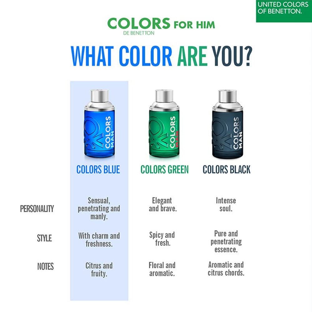 Benetton Colors de Benetton Man Blue Eau de Toilette is an irresistible fragrance with a unique scent to accompany you all day long. Enjoy a colourful revolution with United Colors of Benetton fragrances. Discover the world of fragrances that will suit every free-spirited person. Benetton fragrances are full of colour, freedom, and contrasts so youll never get bored. The pink one will wrap you in a delicate floral cloak with hints of fruit, while the purple one brings intense femininity thanks to notes of jasmine, rose, or freesia with a sweet drydown. Colors of Benetton fragrances for men will seduce you with their fresh citrus compositions enriched with juniper, coriander, or cedar wood.