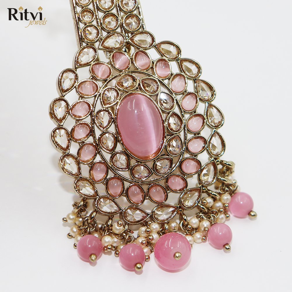 At its heart lies a large, oval light pink centerpiece stone, radiating understated luxury. The lower fringe is adorned with dangling baby pink beads and miniature pearls, adding movement and charm to the piece. The design is framed in a warm gold-toned base that enhances the sparkle of the uncut-style stones.